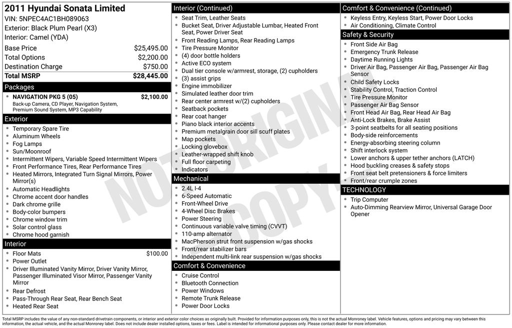 We invite you to experience the refined sophistication and exceptional value of this 2011 Hyundai Sonata Limited. Schedule a test drive today and discover how this remarkable sedan can elevate your driving experience. Our knowledgeable sales team is here to answer any questions you may have and ensure a seamless purchase process. We're confident you'll be impressed by the Sonata's exceptional blend of style, performance, and features.