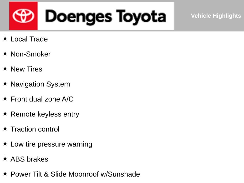 - Navigation System, Front Dual Zone A/C, Remote Keyless Entry, Traction Control, ABS Brakes, Low Tire Pressure Warning, Power Moonroof, and more
