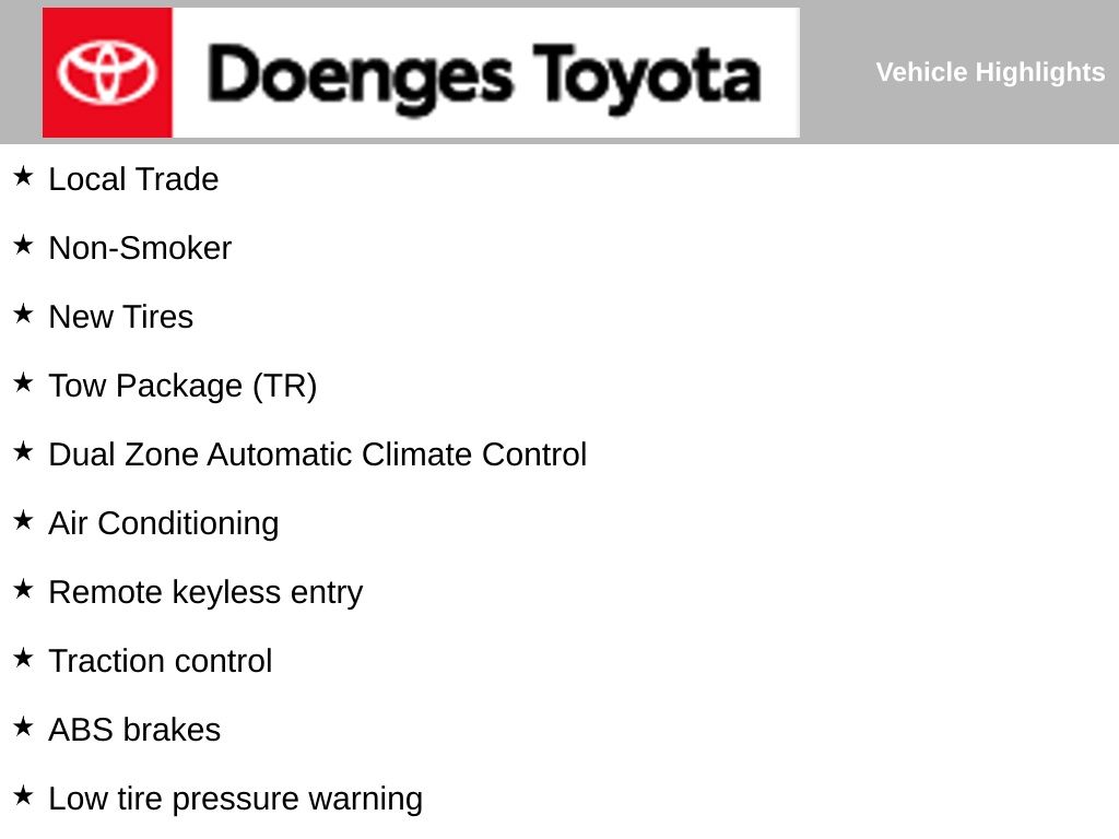 *All vehicles are subject to prior sale. TSRP and equipment on new vehicles in the build phase may change before final assembly and delivery to Doenges Toyota. Vehicle pricing does not include government tax, title, lien entry, and registration fees which must be paid by the purchaser. Pricing is subject to change. While great effort is made to ensure accuracy of the information on this site, errors may occur. Please call us at (877) 620-9449 or visit the dealership for details and to confirm vehicle availability.