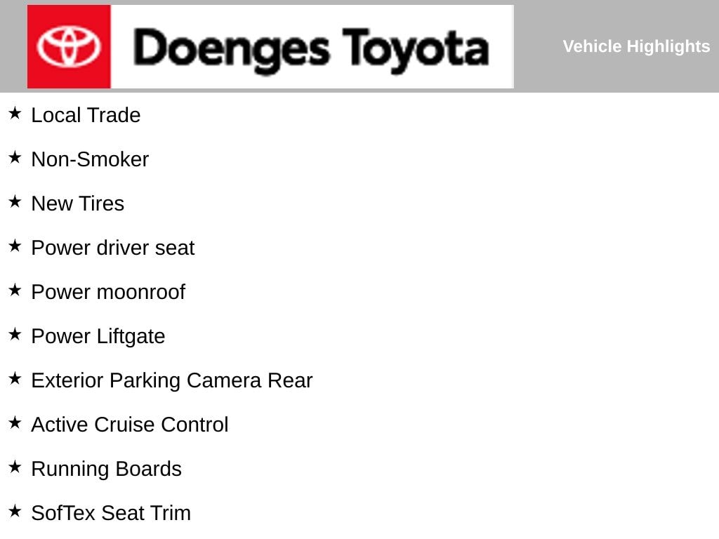 Safety is paramount in the Highlander XLE, which comes equipped with a suite of advanced driver-assistance technologies. Benefit from the peace of mind provided by features like the Exterior Parking Camera Rear, Active Cruise Control, and Toyota Safety Sense, which includes Pre-Collision System with Pedestrian Detection, Lane Departure Alert with Steering Assist, and more.