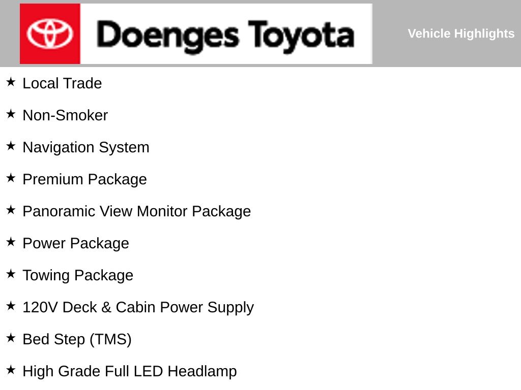 Powered by a robust 3.4L V6 engine paired with a smooth-shifting 10-speed automatic transmission, the Tundra Limited delivers exceptional performance and efficiency, with an EPA-estimated 17 city/22 highway mpg. Its four-wheel-drive system provides the confidence to tackle any terrain, while the Panoramic View Monitor and Bed Step make maneuvering and loading a breeze.